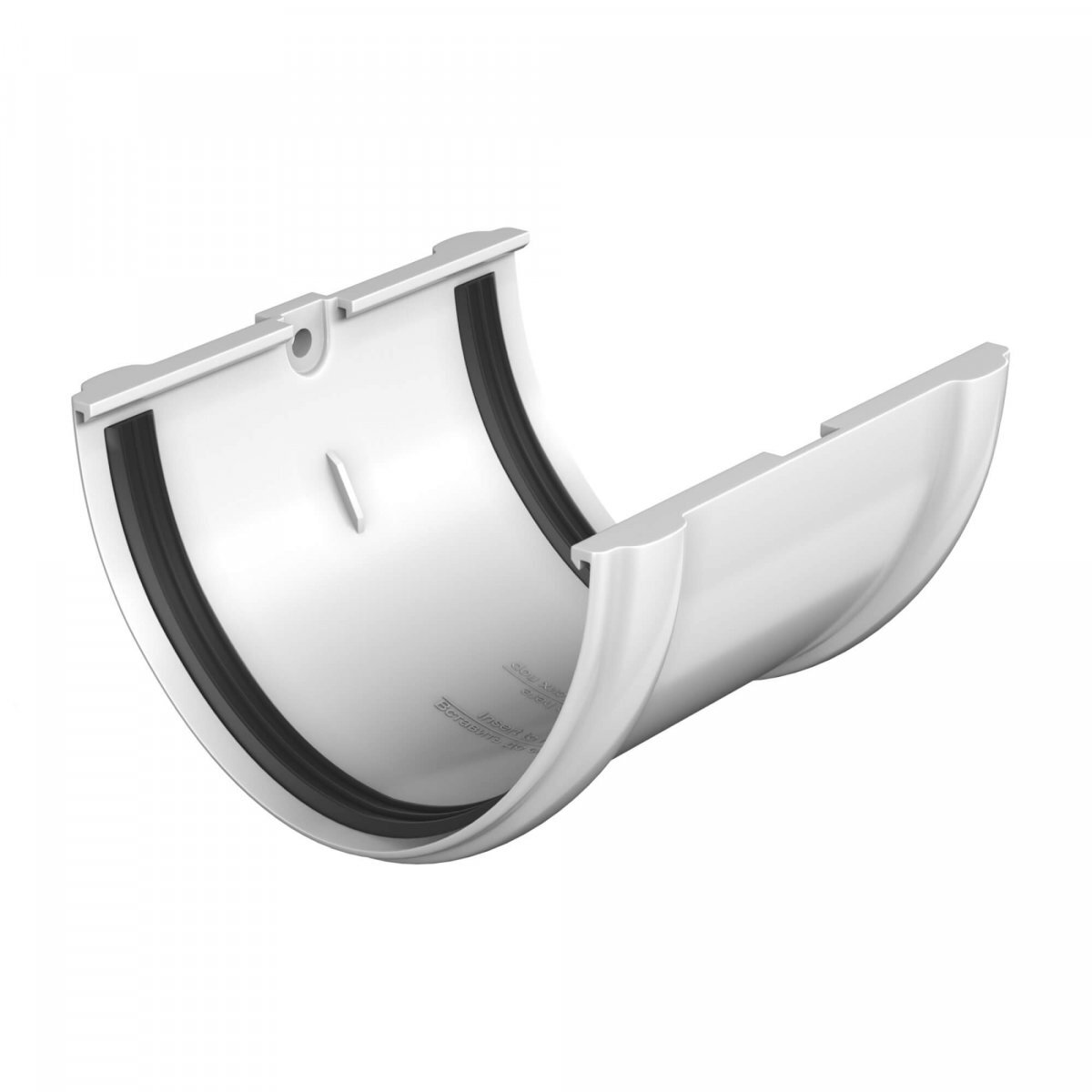 Соединитель предназначен для соединения между собой водосточных желобов. Герметичность стыка обеспечивает резиновый уплотнитель.